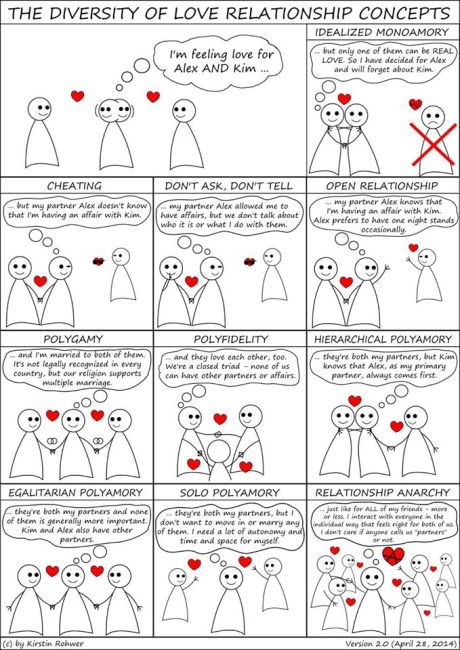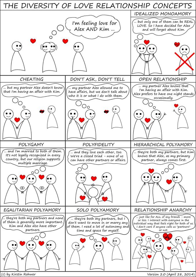 Das konkrete Infragestellen der konventionellen Sichtweise, dass eine monogame Zweierbeziehung die einzig erstrebenswerte oder mögliche Form des Zusammenlebens darstellt – und zwar in Form der Möglichkeit, langfristig tiefgehende Liebesbeziehungen mit mehr als einem Partner zur selben Zeit führen zu können, im vollen Wissen und der Zustimmung aller Beteiligten.